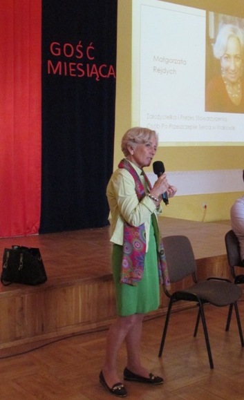 W dniu 16.04.2018 r., Gościem w naszej szkole była pani Małgorzata Rejdych. Pani Małgorzata mieszka w Krakowie, w tym mieście urodziła się dwukrotnie. Ponad 20 lat temu zachorowała poważnie na serce, umierała. Uratował ją przeszczep serca, dokonany w 1998 roku. Od tamtej pory żyje drugi raz. Jakie jest to drugie życie? Intensywne, świadome i piękne. Po roku od operacji wróciła do życia zawodowego, prowadzi dom, uprawia działkę, działa charytatywnie. Od 15 lat prowadzi założone przez siebie Stowarzyszenie Osób Po Przeszczepie Serca; pomaga pacjentom takim jak ona, po transplantacji serca, wspiera oczekujących na operację i ich rodziny. Uczestniczy w szkoleniach, wykładach i spotkaniach propagujących transplantację jako metodę ratowania życia pacjentom ze skrajną niewydolnością narządów. Daje świadectwo sensu i konieczności rozwoju transplantologii. Jej pasje to podróże, sport, szczególnie wędrówki piesze, jazda na rowerze, pływanie. Pani Małgorzata kocha góry, marzy o zdobyciu Korony Polski.